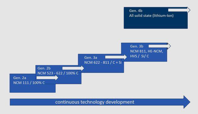 2030年發(fā)展路線圖主要考慮基于改性鎳鈷錳氧化物(NMC)材料的鋰基技術(shù),從NMC 111到NMC 811,使鎳含量增加,鈷含量降低,還有碳/硅復(fù)合材料的高電容負(fù)極材料的應(yīng)用。固態(tài)技術(shù)也將有針對(duì)性地提高能量密度和安全性。