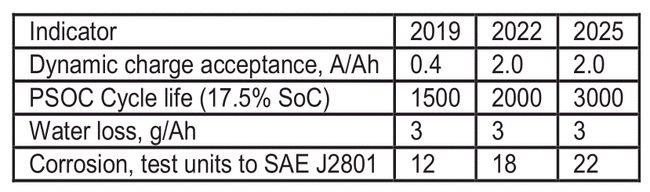 汽車啟/停和微混動(dòng)力電池關(guān)鍵性能指標(biāo)及中期目標(biāo)