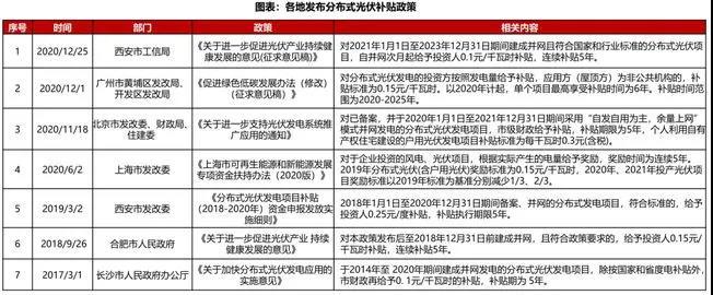 各地政府相繼發(fā)布分布式光伏補貼政策,戶用光伏在補貼下有望快速發(fā)展。2020年以來,上海、北京、廣州、西安等地均發(fā)布補貼政策,給予分布式光伏5到6年的補貼,其中,北京市對于個人利用自有產權住宅建設的戶用光伏發(fā)電項目給予了較大力度的補貼,補貼標準達到每千瓦時0.3元(含稅),補貼期限5年。