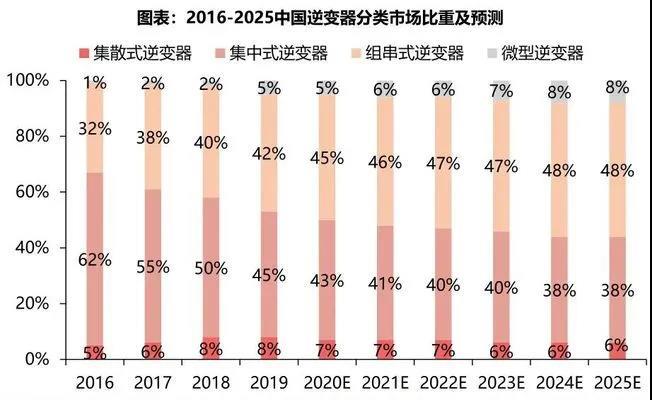 組串式逆變器優(yōu)勢明顯,占比穩(wěn)步提升。集中式逆變器功率大,一般只用于大型地面電站;組串式逆變器功率范圍廣,可適用各類型電站,同時具有體積小、重量輕、多路MPPT提高發(fā)電量等優(yōu)勢,近年來因成本下降和易于維護的特點,開始逐步替代集中式逆變器。隨著分布式光伏占比的提升,組串式逆變器替代集中逆變器正成為趨勢,2019年組串式逆變器占比上升至42%,有望持續(xù)上升。
