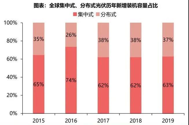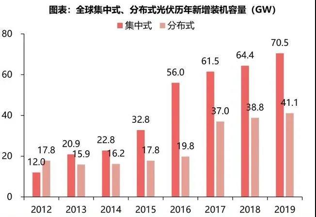 全球分布式光伏裝機有回升趨勢。2012年全球新增光伏裝機分布式規(guī)模大于集中式,隨后數(shù)年集中式光伏快速發(fā)展(尤其是我國),在新增裝機規(guī)模中的比重不斷提升,在2016年達到74%。在2017年到2019年間,分布式裝機規(guī)模占比則相對之前有較大的回升,2019年全球分布式光伏裝機規(guī)模41.1GW,占比37%。隨著分布式光伏的優(yōu)勢逐漸發(fā)揮,分布式光伏裝機規(guī)模及占比有望進一步提升。