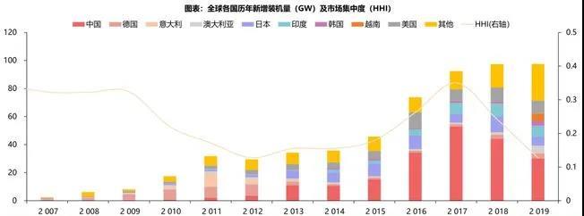 逆變器需求多點開花。逆變器需求主要來自新增光伏裝機,目前全球新增光伏裝機區(qū)域多點開花。中國光伏新增裝機量占據(jù)全球重要一席,與此同時,亞太地區(qū)的越南、韓國高速增長,日本、印度市場也維持較高水平;歐洲市場在西班牙、德國市場的帶領下開始復蘇;以美國為主的美洲市場依然穩(wěn)固;澳大利亞也高速增長。2019年全球新增光伏裝機超GW級的國家或地區(qū)超過13個,按國家或地區(qū)劃分的市場集中度(HHI)達到歷史最低點。隨著全球光伏平價時代的到來,光伏裝機多極化發(fā)展的態(tài)勢有望繼續(xù)保持。
