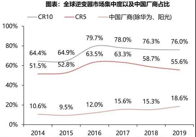 市場集中度較高,CR10占比超過70%。從出貨量市場份額集中度來看,全球逆變器市場集中度較高,近年來CR10超過70%,CR5超過50%。2019年CR5為55.6%,較2016年有一定程度下降,這主要是因為中國新秀廠商不斷向外擴張搶占了原有巨頭廠商的市場份額,中國逆變器廠商(除陽光和華為)市占率從2015年的9.5%提升至2019年的18.6%,而德國的SMA、意大利的Fimer和日本的TMEIC的市場份額均在此期間出現(xiàn)較大程度的下滑。