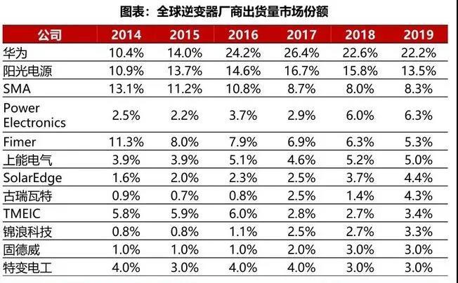 中國廠商崛起,華為和陽光電源處龍頭地位。自2015年華為和陽光電源逆變器出貨量首次超過SMA以來,兩家公司逆變器出貨量持續(xù)增長,2019年逆變器出貨量市場份額分別為22.2%、13.5%,明顯領先排名第三的SMA。除華為和陽光電源外,主打集中式逆變器的上能電氣平穩(wěn)增長,專注中小型組串式逆變器的古瑞瓦特、錦浪科技、固德威等新秀也乘勢成長。