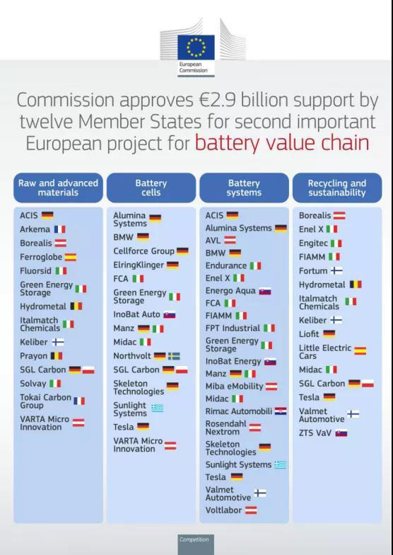該項目是委員會在2019年12月批準(zhǔn)的電池價值鏈中的第一個IPCEI的補充。根據(jù)規(guī)劃,委員會將向法國、德國、瑞典、比利時等12個成員國提供合計29億歐元(約合人民幣228億元)的公共補貼。預(yù)計該項目后期還將吸引額外90億歐元(約合人民幣707億元)的私人投資。