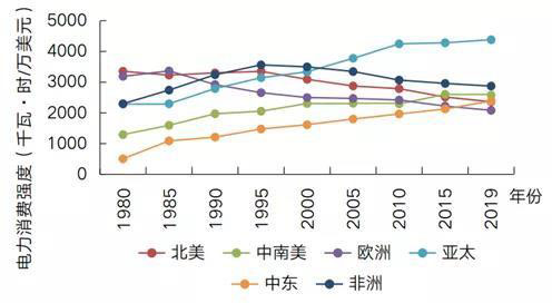 圖1-6 1980—2019年分地區(qū)電力消費(fèi)強(qiáng)度變化