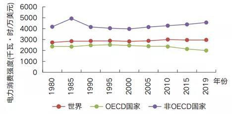 圖1-5 1980—2019年世界及OECD/非OECD國家電力消費(fèi)強(qiáng)度變化