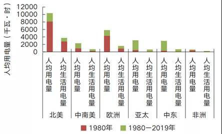 圖1-4 1980—2019年分地區(qū)人均用電量