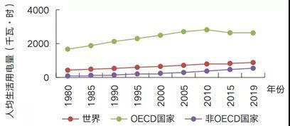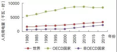 圖1-3 1980—2019年世界及OECD/非OECD國家人均用電量及人均生活用電量變化