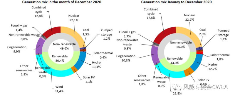 上左:2020年12月西班牙發(fā)電量組成(風(fēng)能31.4%,第一大發(fā)電形式,超過(guò)22.1%的核電和13.4%的水電),上右圖,2020年全年發(fā)電量組成(風(fēng)能占比21.8%,弱低于核電的22.2%)。