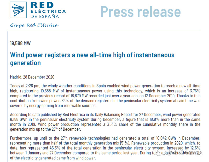 特別值得一提的是,2020年12月28日創(chuàng)下了2007年以來(lái)西班牙風(fēng)力發(fā)電最高發(fā)電紀(jì)錄,達(dá)到403.8 GWh。在28日的下午2時(shí)28分,西班牙的大風(fēng)天氣使得風(fēng)力發(fā)電達(dá)到了歷史新高,風(fēng)電的瞬時(shí)發(fā)電容量為19,588MW,與2019年12月13日創(chuàng)記錄的18,879相比,增長(zhǎng)了3.76%。得益于風(fēng)力發(fā)電的貢獻(xiàn),該段時(shí)間西班牙半島電力系統(tǒng)的電力需求的83%由可再生電能所滿足。