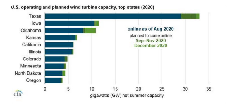 從各州來看,得克薩斯州的風(fēng)電裝機容量最大,截至2020年8月已安裝29.1吉瓦。德克薩斯州的項目開發(fā)人員預(yù)計到今年年底將再增加4.0吉瓦。項目開發(fā)商計劃在俄克拉荷馬州增加2.7吉瓦的裝機容量,將該州的風(fēng)電容量從8.2吉瓦增加到10.9吉瓦。