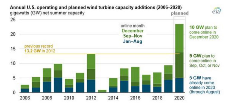 中國儲能網(wǎng)訊:根據(jù)美國能源信息署(EIA)收集的數(shù)據(jù), 2020年,預(yù)計美國將新增風(fēng)機裝機容量超過23吉瓦,遠(yuǎn)遠(yuǎn)超過2012年創(chuàng)下的13.2吉瓦水平。