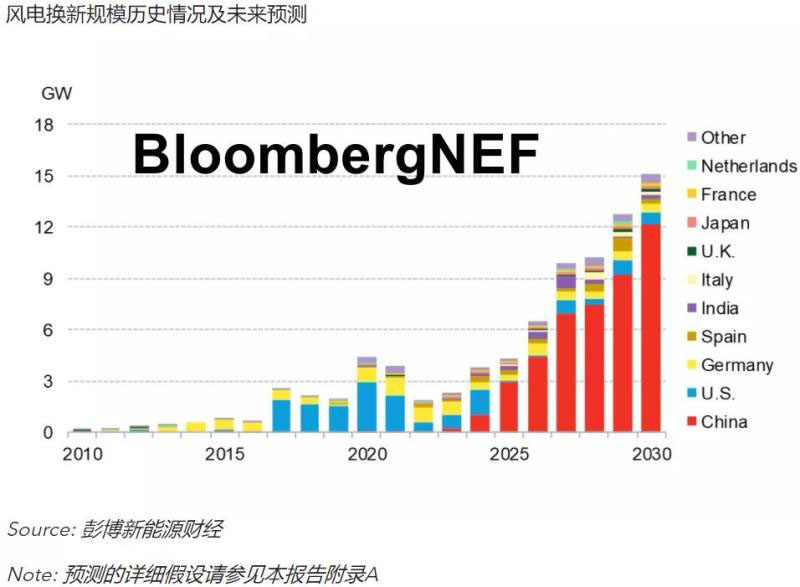 換新包括場內(nèi)風機部件升級改造或完全換新。美國和德國的換新市場發(fā)展強勁,到2024年,換新規(guī)模預計增至近12GW。此后,中國風機提前退役將再次掀起換新潮。