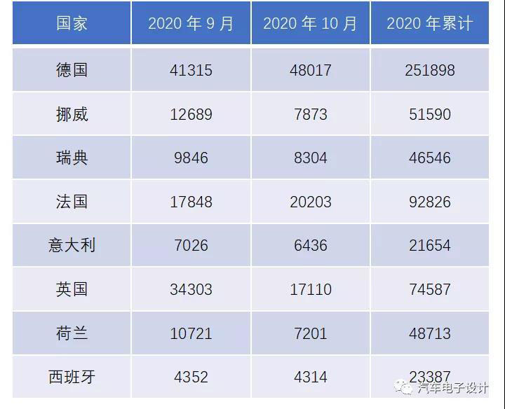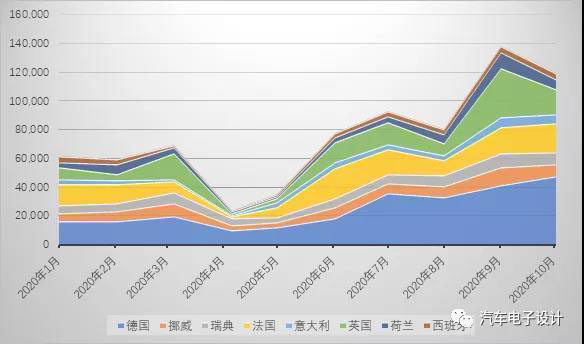 中國儲能網(wǎng)訊:昨天歐洲主要國家都發(fā)布了汽車的銷量,總體來看10月主要國家的新能源汽車的數(shù)據(jù)真的很不錯(德國4.8萬,法國2萬和英國1.7萬臺),要不是法國和德國因為疫情有所調(diào)整,今年整個歐洲估計能拉到120萬的量級。主要的8個國家的銷量為11.94萬臺,預估歐洲這個月會超過14.74萬。