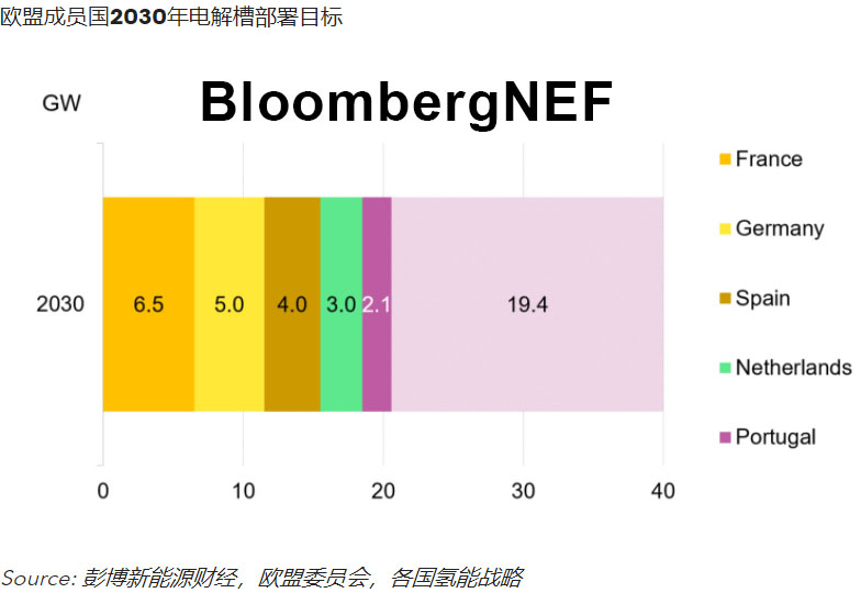 西葡兩國的戰(zhàn)略草案提及了2030年用于綠氫制取的電解槽部署目標,分別為4GW和2.1GW。兩國提出的目標相當于歐盟委員會提出的到2030年歐盟電解槽部署40GW目標的15%。伊比利亞半島僅占歐盟GDP的10%,由此看來,兩國目標可謂雄心勃勃。至此,歐盟成員國2030年制氫電解槽計劃部署規(guī)模超過20GW。