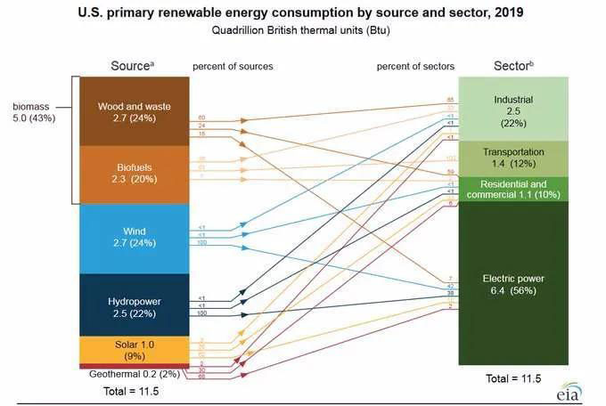 各國的可再生能源統(tǒng)計(jì)一般都是從供應(yīng)的角度出發(fā),描述不同來源的可再生能源的供應(yīng)量。根據(jù)美國能源信息署的數(shù)據(jù),2019年,美國可再生能源供應(yīng)為11.5夸特(Quadrillion BTU,10的15次方英熱單位),其中木柴和廢棄物占24%、生物燃料占20%、風(fēng)電占24%、水電占22%、太陽能占9%、地?zé)嵴?.2%。