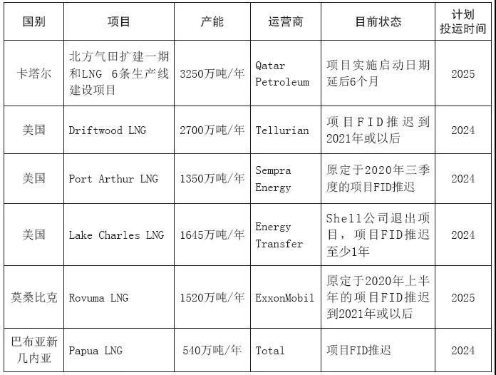 2020年3月,俄羅斯石油公司調(diào)整總產(chǎn)量超過400億立方米的Rospan和Kharampur天然氣項(xiàng)目的啟動(dòng)期。其中Kharampur項(xiàng)目啟動(dòng)日期被推遲到2021年,Rospan項(xiàng)目預(yù)計(jì)今年投入運(yùn)營,但啟動(dòng)日期已多次推遲。4月,殼牌表示將美國墨西哥灣南部Whale油氣田和英國北海Jackdaw天然氣田的FID推遲至2021年。同月,卡塔爾將北部天然氣出口項(xiàng)目擴(kuò)建工程開工時(shí)間推遲至2025年,該項(xiàng)目擴(kuò)建工程完成后LNG產(chǎn)能將達(dá)到1.1億噸/年。