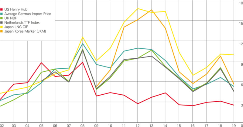 圖5 2002~2019年全球天然氣主要基準(zhǔn)價(jià)格(單位:美元/百萬英熱單位)