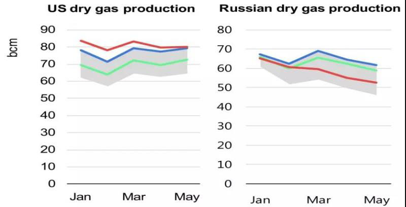 全球天然氣需求降低的影響并未完全在供應(yīng)側(cè)顯現(xiàn)。2020年前幾個(gè)月,與2019年同期相比,全球LNG供應(yīng)量、美國天然氣產(chǎn)量仍在增加,而俄羅斯天然氣產(chǎn)量卻有所下降。1~5月,盡管國內(nèi)天然氣需求下降,但是受出口貿(mào)易帶動(dòng),美國天然氣產(chǎn)量同比增長(zhǎng)5.3%;由于對(duì)歐洲的管道天然氣出口量減少,以及供暖需求降低導(dǎo)致的國內(nèi)消費(fèi)量下降,俄羅斯天然氣產(chǎn)量同比下降9%。
