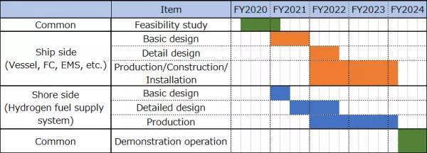 項目的目標(biāo)是共同開發(fā)一艘約150噸級(即載客量約為100人)的大功率燃料電池船,它將作為一艘中型旅游船使用,并在2024年進行示范性的營運和氫燃料供應(yīng)。具體計劃是:2020年9月開始燃料電池船以及氫燃料供應(yīng)的可行性研究,2021年開始設(shè)計船體和氫燃料供應(yīng)設(shè)備,2023年開始實際建造和生產(chǎn),2024年在橫濱港口海岸試航。