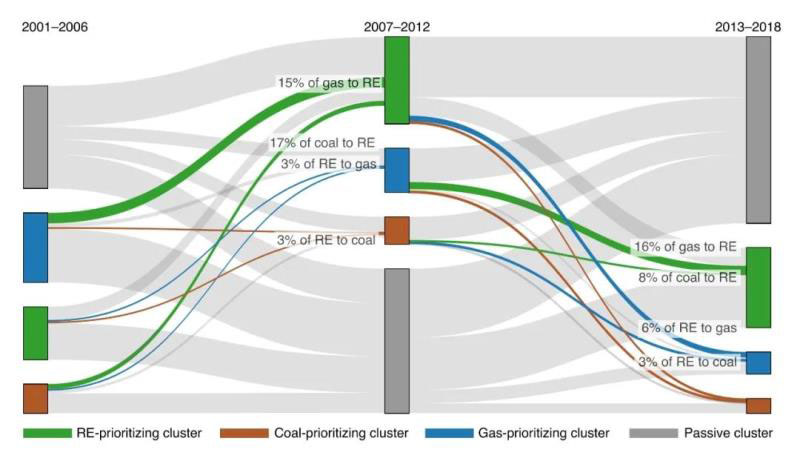 這一研究系統(tǒng)地量化評(píng)估了2000年-2018年間全球3000多家電力公司從化石燃料發(fā)電能力向可再生能源的轉(zhuǎn)變,結(jié)果發(fā)現(xiàn)大約75%的公司被歸為“被動(dòng)型”,其能源結(jié)構(gòu)沒有實(shí)質(zhì)性變化。只有10%的公司優(yōu)先考慮可再生能源,但是即便在這10%的范圍內(nèi),許多公司還在繼續(xù)增加新的煤炭和天然氣電源;其余15%的公司優(yōu)先考慮煤炭或天然氣電源。