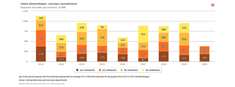 由于新冠病毒的影響,2020年上半年法國光伏安裝量低于前幾年。2020年1月至6月底,13103個新建光伏電站中,不到1%的光伏電站的功率大于250千瓦,占新增容量的44%;低于9千瓦的小型裝置占總數的近84%。