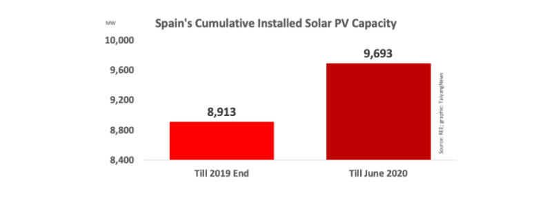 西班牙電網(wǎng)公司在今年7月份發(fā)布公告,盡管該國經(jīng)濟(jì)受疫情打擊嚴(yán)重,但上半年新增了780MW的光伏和446MW的風(fēng)力發(fā)電。其中光伏的新增裝機(jī)主要得益于西班牙Iberdrola公司的500MW太陽能發(fā)電項(xiàng)目的上線。根據(jù)2020年上半年的數(shù)據(jù),截6月底,西班牙累計(jì)太陽能光伏裝機(jī)容量達(dá)到9.693 GW。