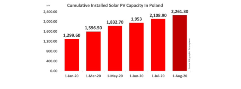 波蘭電網(wǎng)PSE的數(shù)據(jù)顯示,到2020年8月1日,波蘭的累計(jì)安裝和并網(wǎng)太陽能光伏發(fā)電量達(dá)到2,261.347 MW。其中,前六個(gè)月新增光伏809MW。七月份安裝了超過152MW的光伏,波蘭可再生能源研究所(IEO)表示,該國到2020年底可達(dá)到2.5 GW的累計(jì)裝機(jī)容量,到2025年,這一數(shù)據(jù)有望增至7.8 GW。