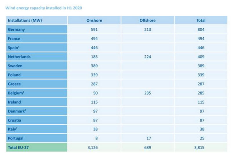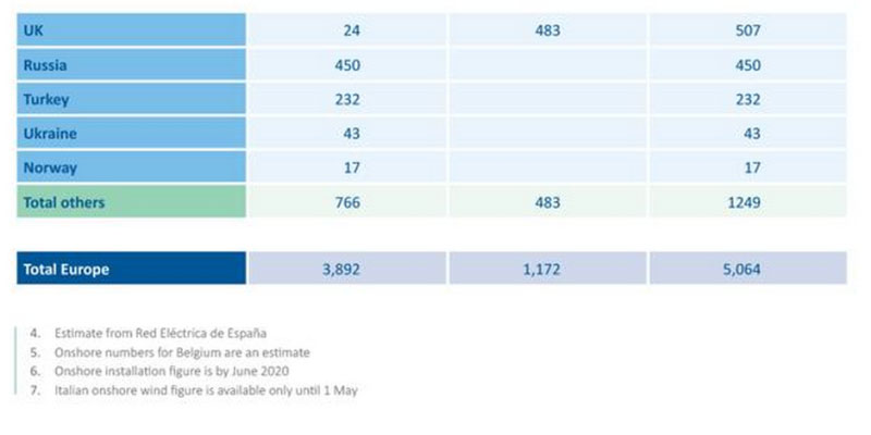 盡管風(fēng)能行業(yè)在上半年受到嚴(yán)重干擾,但裝機(jī)水平與前幾年相當(dāng)。 下表為2020年上半年歐洲各國裝機(jī)統(tǒng)計(jì)表。