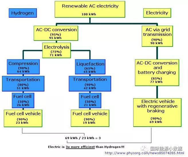 根據(jù)Phys.org的估算,可再生能源(如風(fēng)電、光伏)發(fā)電100千瓦時分別用于氫能(燃料電池)汽車、電動汽車最終利用效率如何?