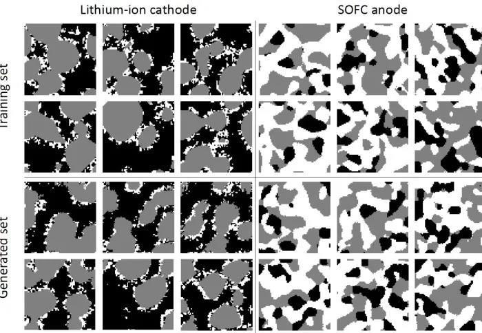 當運行3D仿真模型以預(yù)測電池性能時,研究人員需要足夠大的數(shù)據(jù)量,在統(tǒng)計學(xué)上代表整個電池。目前很難獲取分辨率達標的大量微觀結(jié)構(gòu)的圖像數(shù)據(jù)。不過,研究人員發(fā)現(xiàn),可以通過訓(xùn)練代碼來生成具有相同屬性、更大的數(shù)據(jù)集,或者有意地生成結(jié)構(gòu),此種結(jié)構(gòu)能夠建立性能更佳電池的模型。