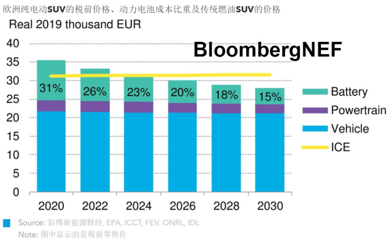 歐洲大型汽車市場和美國SUV市場等車型價格較高的汽車細分市場中,我們預計新能源汽車和燃油車最早于2022年實現(xiàn)平價。到2023年至2024年,動力電池占整車成本中的比重預計降至20%或以下,電動馬達約占整車成本的8%到10%,純電動力總成汽車整車成本與燃油車相近。