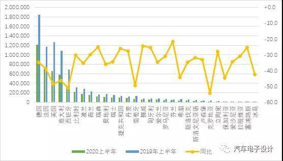 2020年太特殊了,歐洲乘用車銷量受到了很大的負增長,上半年歐盟、歐洲自由貿(mào)易聯(lián)盟(EFTA)和英國的乘用車銷量共計510萬輛,同比下滑39.5%,為十幾年來的最低水平??偹汶S著逐步好轉(zhuǎn),6月單月銷量為113萬輛,同比下滑24%,與之前兩個月78%和57%的跌幅相比有所收窄。幾乎所有的歐洲國家的乘用車銷量降幅都超過20%以上的下降,其中克羅地亞、葡萄牙、西班牙等國都是-50%的腰斬式下降。歐洲前五大市場,德國銷量為121萬輛,較去年同期下跌34.5%,為30年來的新低;法國為71.6萬輛,同比下滑38.6%;英國為65.3萬輛,同比下滑48.5%;意大利為58.4萬輛,同比下滑46.1%;西班牙為34萬輛,同比下滑50.9%。