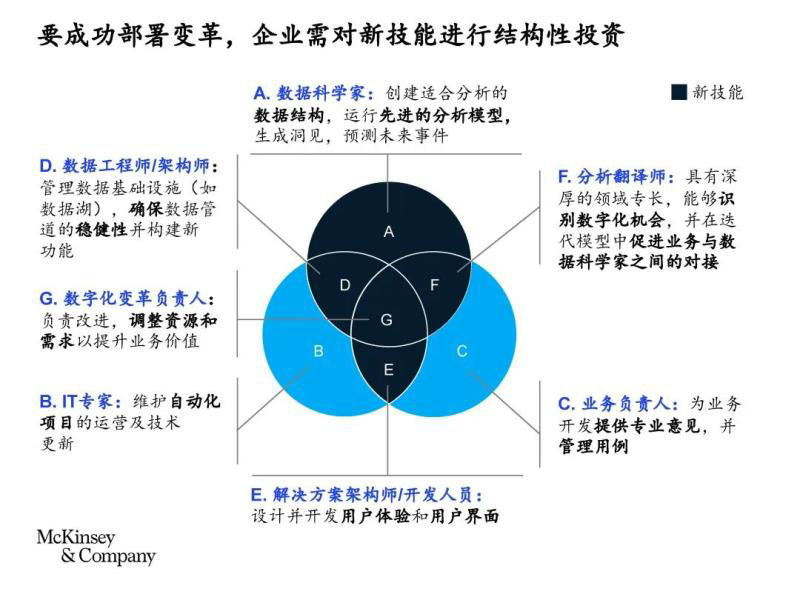 企業(yè)需要有人來管理機(jī)器、運(yùn)行控制塔和數(shù)字孿生。他們希望員工能夠進(jìn)行數(shù)字化績效管理,解讀從車間成千上萬個(gè)傳感器中提取的數(shù)據(jù)、找到提高產(chǎn)量的方法,并得出可落地的洞見。企業(yè)需要更多的IT人員來開發(fā)可訪問海量數(shù)據(jù)的應(yīng)用程序。除去數(shù)據(jù)科學(xué)家、數(shù)據(jù)工程師和技術(shù)領(lǐng)導(dǎo)人員外,企業(yè)還需要招募各個(gè)領(lǐng)域的專家、數(shù)字和分析翻譯人員,以及產(chǎn)品負(fù)責(zé)人。產(chǎn)品負(fù)責(zé)人會(huì)與業(yè)務(wù)和職能領(lǐng)導(dǎo)層,以及數(shù)據(jù)和技術(shù)專家組成的團(tuán)隊(duì)進(jìn)行商討,識別問題并開發(fā)最合適的數(shù)字解決方案(見下圖)。價(jià)值鏈的其他環(huán)節(jié)也必須展開再培訓(xùn):比如,企業(yè)可能需要在采購部門招攬更多的成本工程師,使用成本建模工具來評估設(shè)備和采購成本。