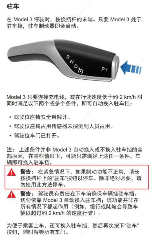 在特斯拉的車主手冊(cè)中,也說(shuō)明了在緊急情況下通過(guò)電子手剎進(jìn)行剎車的操作方法:長(zhǎng)按方向盤后方換擋桿的末端,車輛即可緊急剎車。