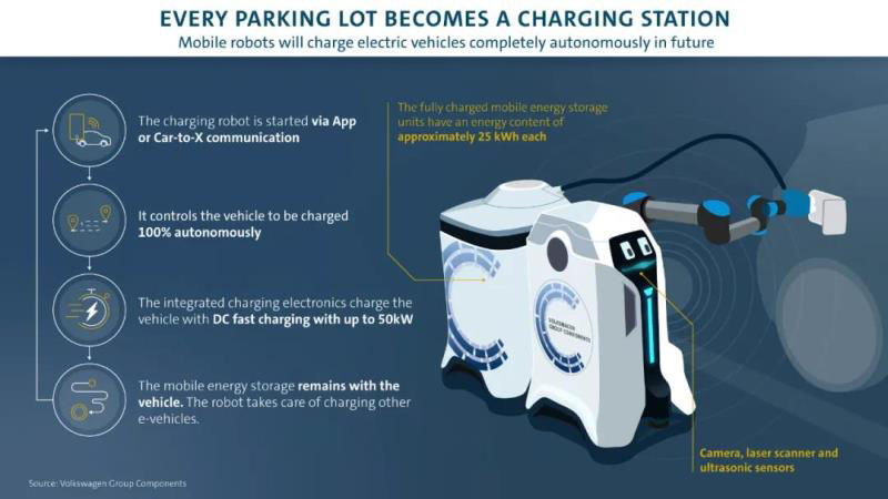 在柔性充電樁的基礎(chǔ)上,大眾汽車(chē)做了一些前瞻性的研究,推出了充電機(jī)器人的概念。車(chē)主在停好車(chē)后,只需在手機(jī)APP上發(fā)出充電指令,充電機(jī)器人即可自動(dòng)完成充電工作。