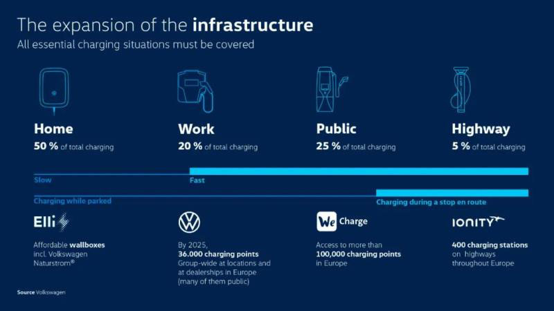 到2025年,大眾集團(tuán)將在整個(gè)歐洲建設(shè)36000個(gè)充電站點(diǎn),總投資約2.5億歐元,其中的11000將由大眾品牌開(kāi)發(fā)。