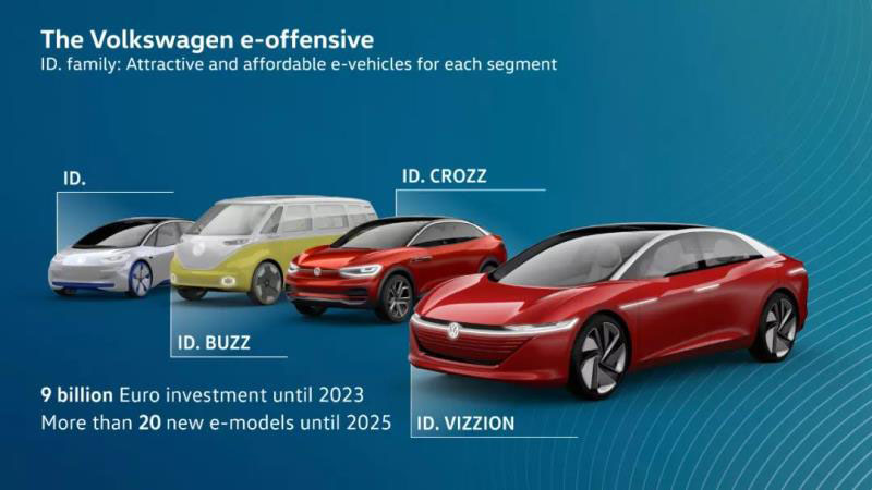2019 年在對(duì)媒體的公開(kāi)上又提出,2023 年以前,將投資 300 億歐元專用于電動(dòng)化,2028 年前推出的純電動(dòng)車(chē)型要達(dá)到 70 款,電動(dòng)車(chē)的累計(jì)產(chǎn)量要達(dá)到 2200 萬(wàn)輛,到 2030年,歐洲與中國(guó)生產(chǎn)的大眾汽車(chē)中電動(dòng)車(chē)占比要超過(guò) 40%。