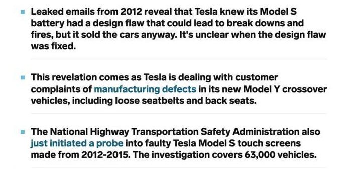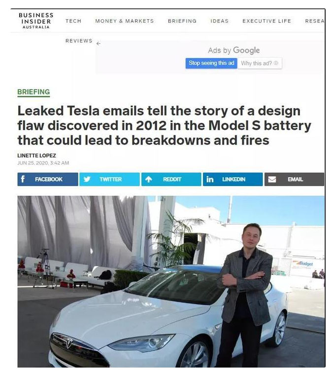 在馬斯克稱貝索斯是抄襲狗之前,外媒Business Insider在25日報(bào)道稱,大量泄露的特斯拉郵件顯示,其在2012年就知道Model S因電池設(shè)計(jì)不當(dāng),可能會(huì)導(dǎo)致短路甚至起火,但管理層為了產(chǎn)量和業(yè)績,選擇視而不見。