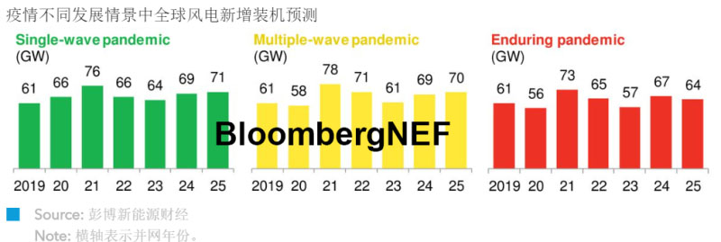 疫情當(dāng)前,風(fēng)電行業(yè)表現(xiàn)出了極強(qiáng)的韌性。即使在受疫情沖擊最嚴(yán)重的國(guó)家,制造業(yè)和建筑業(yè)也已復(fù)工復(fù)產(chǎn)。就2020年而言,疫情的影響主要是延誤項(xiàng)目工期,而非導(dǎo)致項(xiàng)目被取消;然而,若疫情出現(xiàn)多波反彈,風(fēng)電行業(yè)可能遭受重大沖擊;若疫情持續(xù)至2021年,審批流程受阻會(huì)導(dǎo)致競(jìng)價(jià)缺乏競(jìng)爭(zhēng)、中標(biāo)電價(jià)提高。嚴(yán)重的經(jīng)濟(jì)衰退可能會(huì)導(dǎo)致較弱的項(xiàng)目無(wú)法獲得融資。本篇市場(chǎng)前景報(bào)告中,我們探討了三種疫情發(fā)展情景對(duì)未來(lái)風(fēng)電新增裝機(jī)的影響。