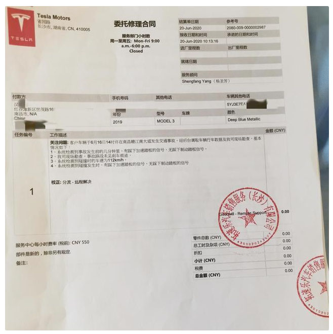 但特斯拉方面否認(rèn)了這次事故是由于Model 3失控且剎車失靈造成的。6月24日,特斯拉在給陳宇夫婦寄出的一份《委托修理合同》中稱,經(jīng)后臺(tái)調(diào)取車輛行駛數(shù)據(jù)及現(xiàn)場勘查情況為,系統(tǒng)檢測到事故發(fā)生前幾分鐘及碰撞時(shí),有踩下加速踏板的信號,無踩下制動(dòng)踏板信號;勘查現(xiàn)場,事故路段未見剎車痕跡等。