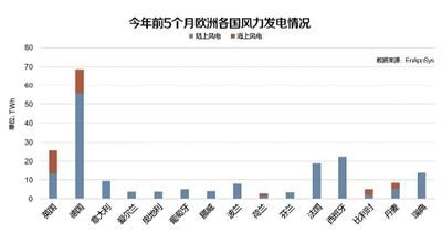 從國(guó)家和地區(qū)來看,報(bào)告顯示,德國(guó)貢獻(xiàn)最大,1—5月風(fēng)力發(fā)電量達(dá)69太瓦時(shí),占?xì)W洲前5個(gè)月風(fēng)力發(fā)電總量的40%。其次為英國(guó),前5個(gè)月風(fēng)力發(fā)電量為25.6太瓦時(shí),占?xì)W洲總量的13%。另有西班牙,以22.3太瓦時(shí)的成績(jī)名列前5個(gè)月歐洲風(fēng)力發(fā)電量排行第三。其中,3月初,西班牙因有強(qiáng)風(fēng)天氣,風(fēng)力發(fā)電量猛增,單周曾達(dá)2太瓦時(shí),約占當(dāng)周歐洲風(fēng)力發(fā)電總量的20%。