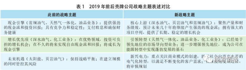 2019年6月,殼牌公司對(duì)業(yè)務(wù)組合的戰(zhàn)略主題進(jìn)行了調(diào)整,確保其業(yè)務(wù)組合能夠很好地適應(yīng)未來發(fā)展環(huán)境(見表1)。新的戰(zhàn)略主題表述,聚焦于有助于推進(jìn)公司能源轉(zhuǎn)型的領(lǐng)域,以及未來十年需求保持增長(zhǎng)的領(lǐng)域。殼牌將繼續(xù)發(fā)展油氣業(yè)務(wù),包括深水和頁巖油氣,以滿足需求增長(zhǎng),通過提供石油、天然氣和低碳能源,強(qiáng)化其在油氣行業(yè)中的領(lǐng)先地位。
