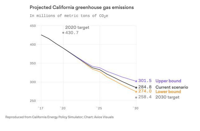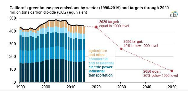 2017年,加州政府頒布州法AB 398,提出了美國最激進的減排目標;計劃到2030年將溫室氣體排放量在1990年水平上減少40%,到2050年實現(xiàn)溫室氣體比1990年減少80%。這意味著加州2030年二氧化碳排放量將從2017年的4.24億噸急劇減少到2.58億噸。