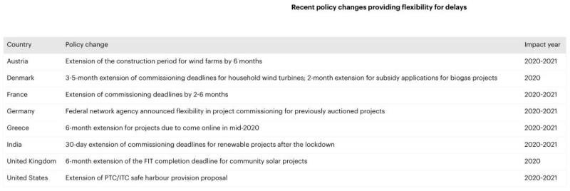 嚴(yán)峻疫情之下,由于供應(yīng)鏈中斷和建筑工地關(guān)閉造成的延誤,許多國家可再生能源項(xiàng)目不能按期在2020年完工,可能會錯(cuò)過既定的補(bǔ)貼和優(yōu)惠政策的期限。為了解決這個(gè)問題,一些國家及時(shí)調(diào)整了政策改革,緩解可再生能源項(xiàng)目遇到的困難。