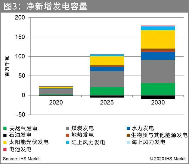 這些已規(guī)劃項(xiàng)目存在一些不確定性。從政府的計(jì)劃和開發(fā)商的項(xiàng)目公告來(lái)看,有5000萬(wàn)千瓦的燃煤發(fā)電和6200萬(wàn)千瓦的燃?xì)獍l(fā)電項(xiàng)目正在考慮之中。這些項(xiàng)目總計(jì)需要約1400億美元的新投資。隨著燃煤發(fā)電獲得的財(cái)政支持逐漸減少,一些擬議項(xiàng)目可能會(huì)從計(jì)劃中剔除。另一方面,燃?xì)獍l(fā)電項(xiàng)目則始終能獲得資金。它們面臨的主要障礙是如何從國(guó)內(nèi)天然氣項(xiàng)目或液化天然氣(LNG)項(xiàng)目獲得天然氣供應(yīng)??紤]到各種制約因素,埃信華邁預(yù)測(cè),到2030年煤炭和燃?xì)獍l(fā)電容量將凈增約9000萬(wàn)千瓦。