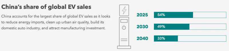 預(yù)計(jì)2025年中國占全球電動(dòng)車銷量的54%、2030年占49%、2040年占33%。