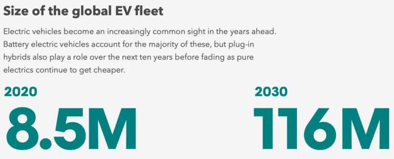 預(yù)計(jì)2020年全球電動(dòng)車存量850萬輛,2030年達(dá)1.16億輛。