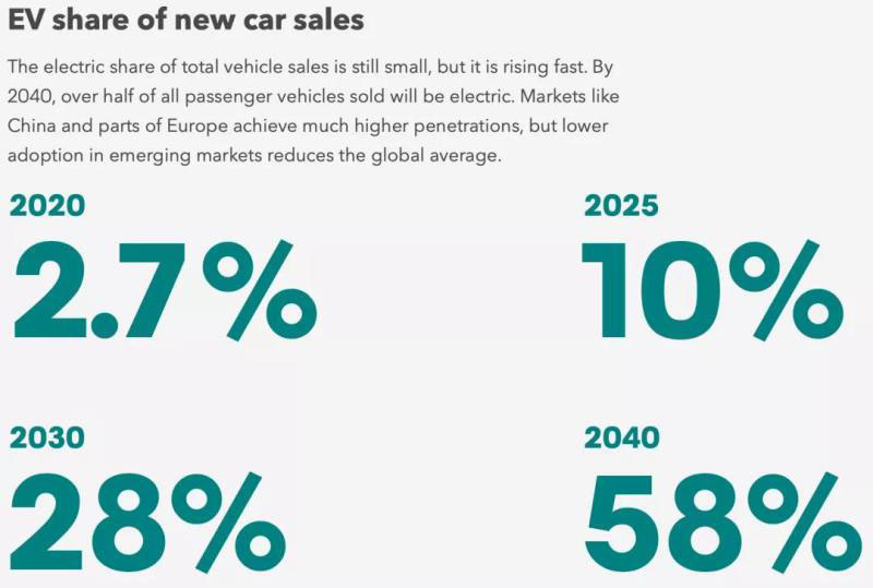 2020年電動(dòng)車占全球乘用汽車市場比例為2.7%,預(yù)計(jì)2025年占比10%、2030年占比28%、2040年占比58%。